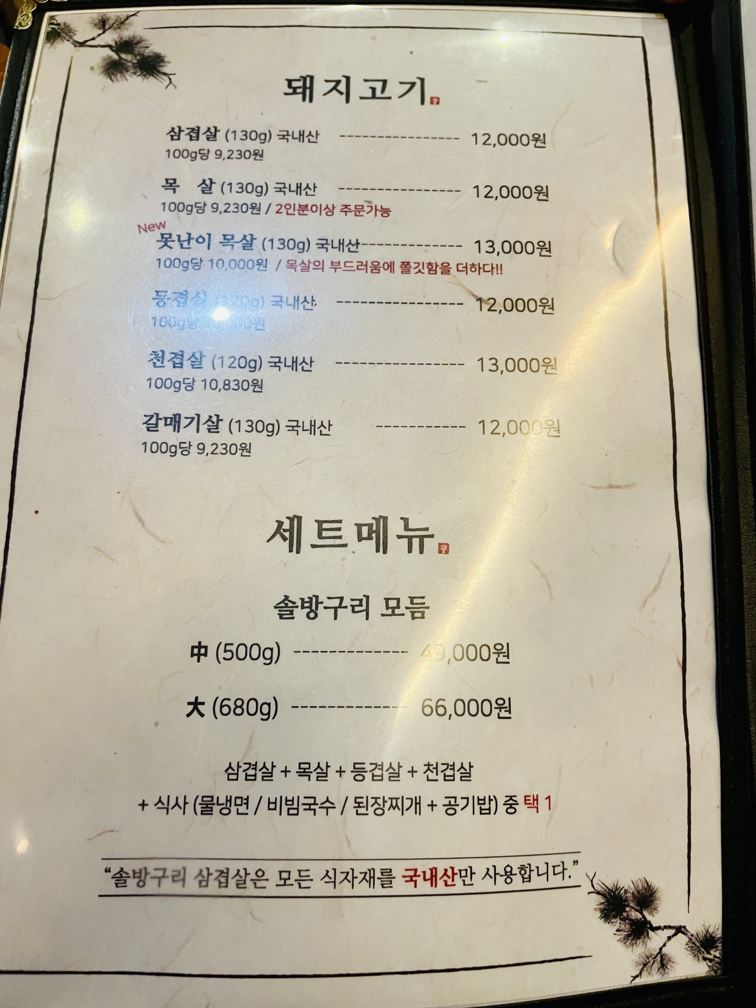 삼겹살과 목살은 1인분에 12,000원이다.