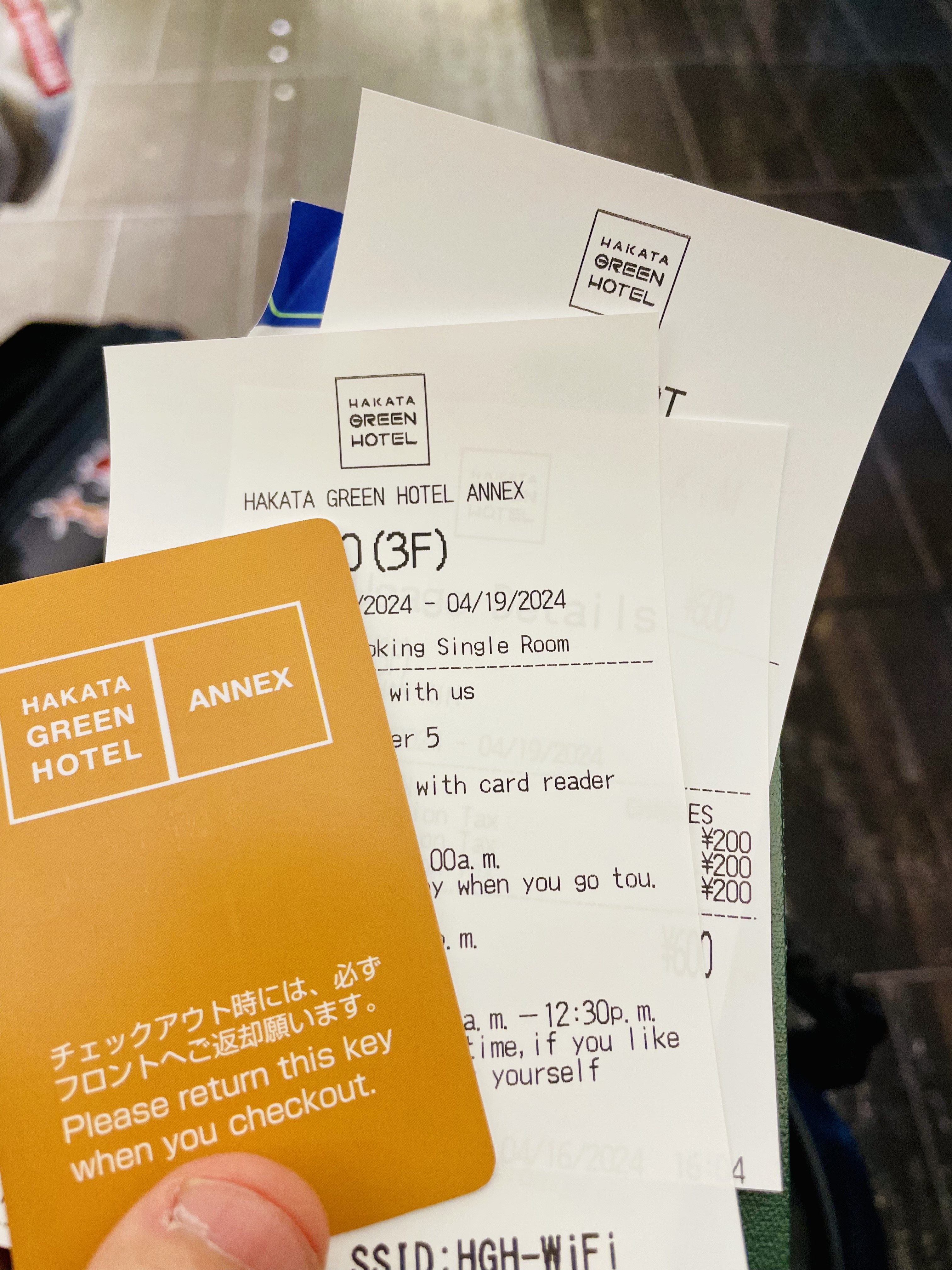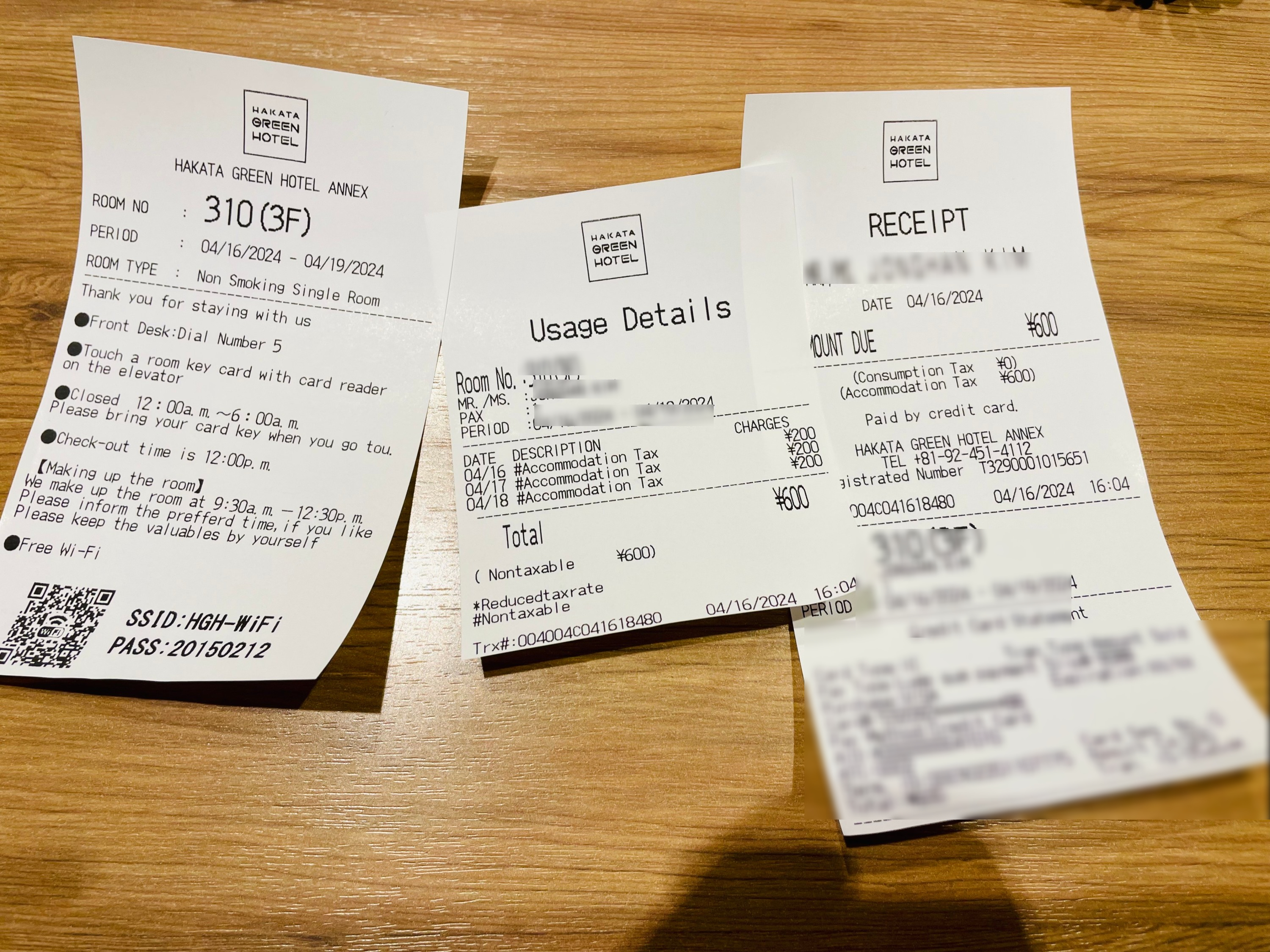 총 3박 했으니 600엔을 카드 결제했다.