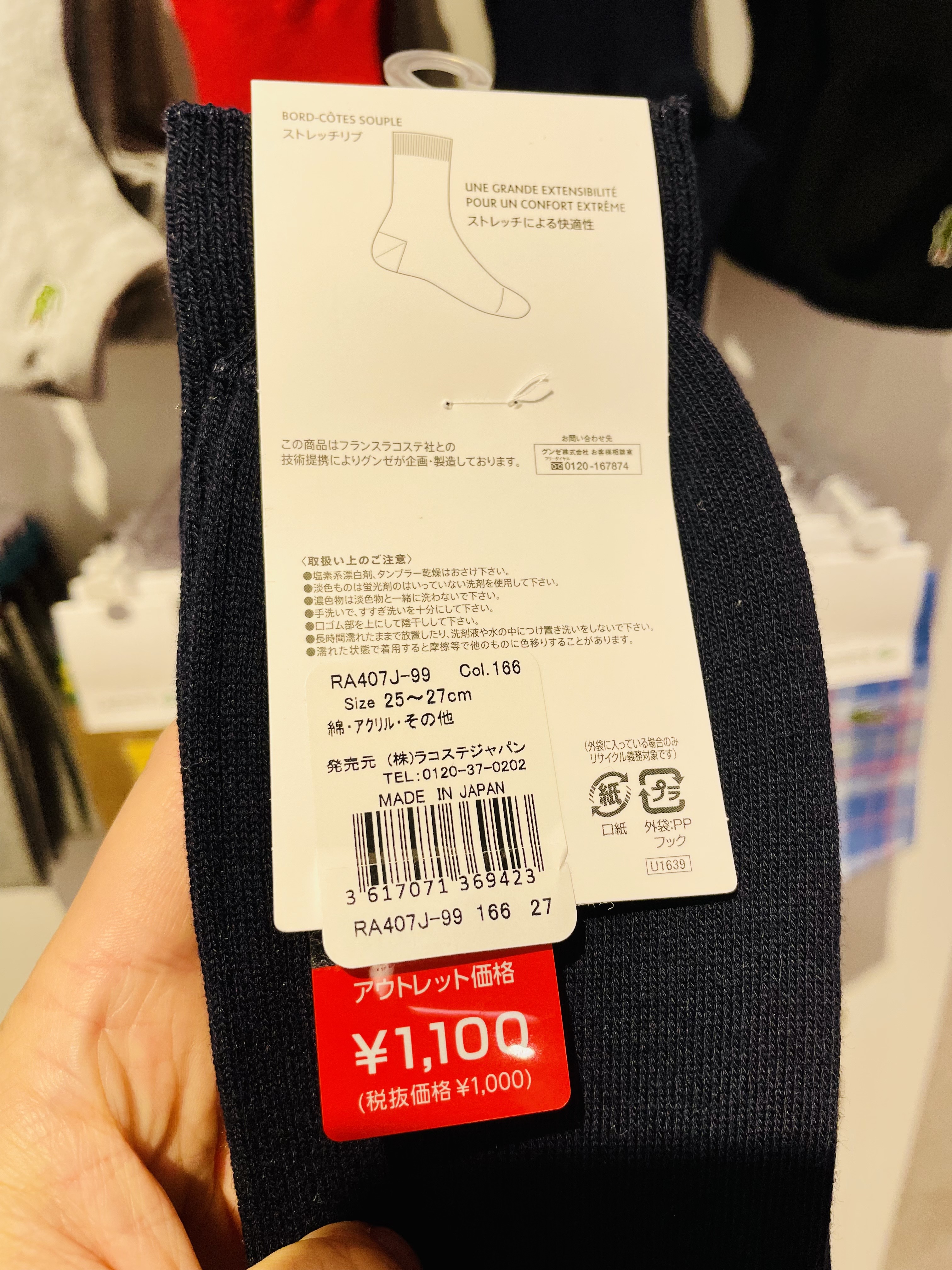 라코스테 양말들이 줄지어 진열되어 있다.